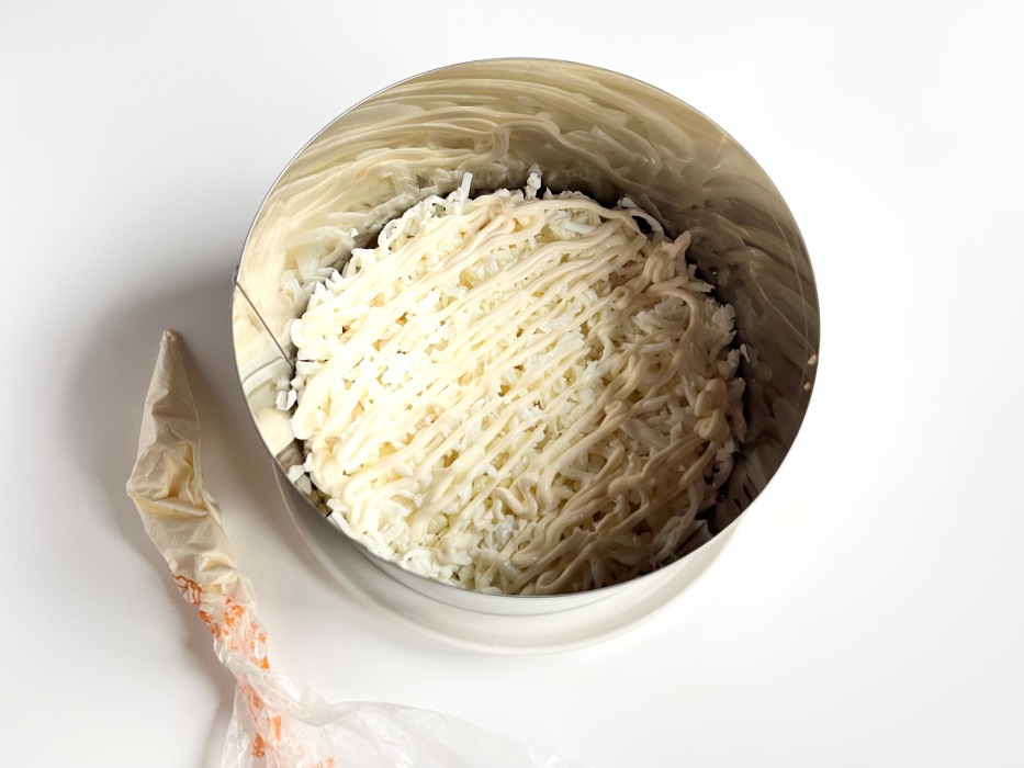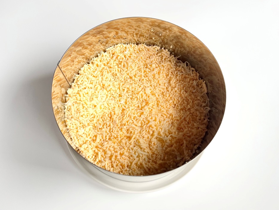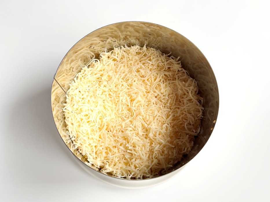 Следующим слоем выложить тертый сыр. Этот слой мы не покрываем майонезом.