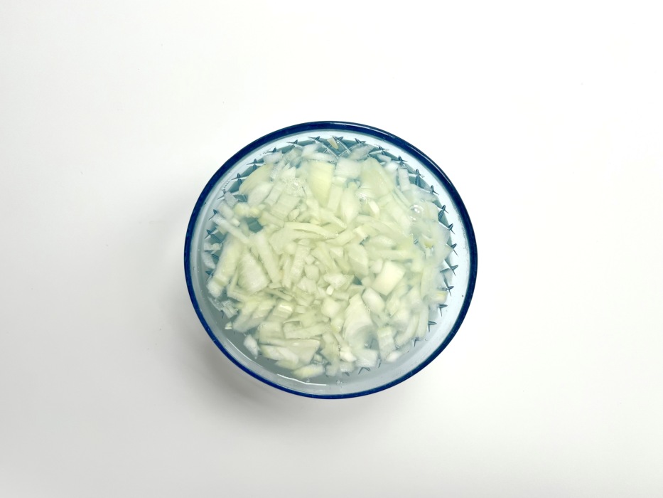 Лук очистить и нарезать мелко. Переложить в глубокую миску и залить кипятком. Подержать лук в кипятке 2-3 минуты, и слить воду или откинуть лук на дуршлаг или сито.