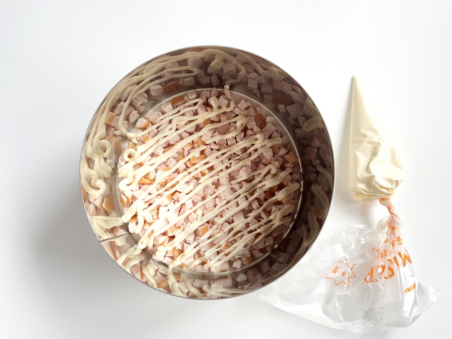 Очень удобно для выкладки майонеза использовать кондитерский мешок или обычный целлофановый пакет, отрезав у него маленький уголок.