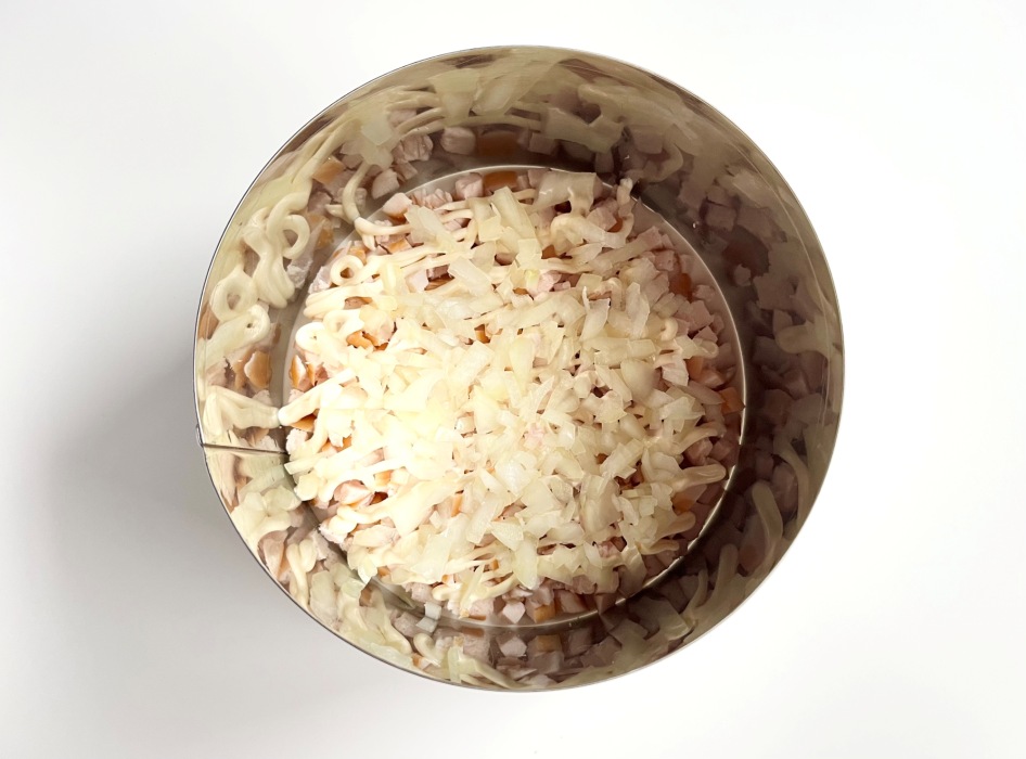 Следующим слоем выложить лук. Равномерно распределить. Этот слой мы не покрываем майонезом.