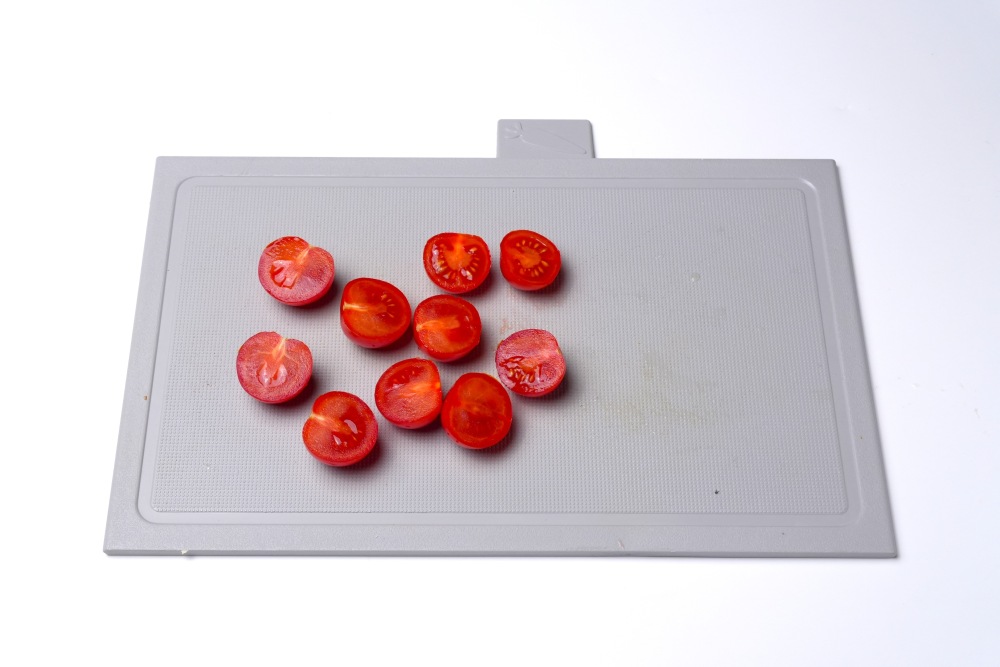 Помидоры черри промыть, обсушить и нарезать пополам.