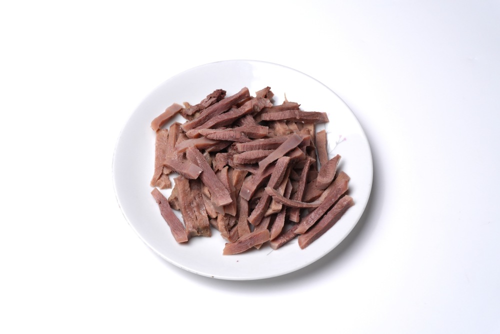 Охлажденный язык нарезать тонкой соломкой. Кончик языка класть в салат не нужно, он трудно прожевывается.