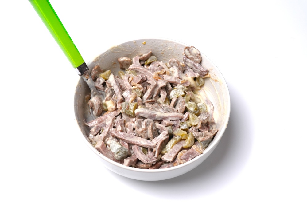 Смешать язык, грибы и огурцы, заправить соусом и перемешать. Добавить соль и перец.