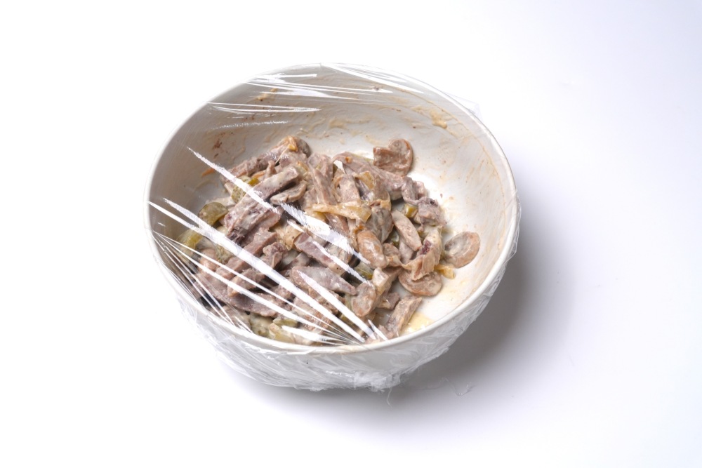 Салат с говяжьим языком и грибами можно приготовить за 8-10 часов до подачи и убрать в холодильник, накрыв пленкой. Либо разбить готовку на несколько дней: за 2-3 дня до мероприятия отварить язык, обернуть пленкой и убрать в холодильник.