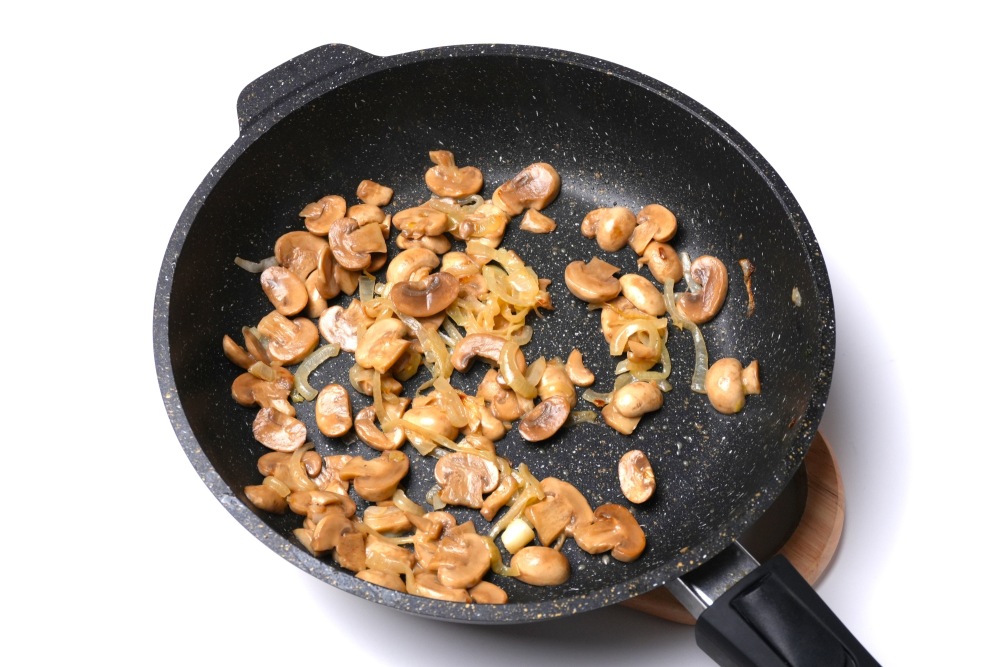 К луку добавить грибы, обжаривать 3-5 минут до корочки.