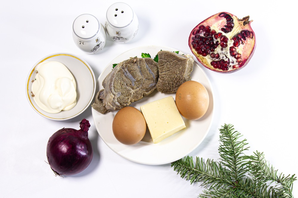 Подготовить говядину для варки (лопатку или грудинку), свежий гранат, куриные яйца, взять твёрдый сыр, небольшую луковицу, майонез (или смесь греческого йогурта с горчицей для более лёгкой заправки), соль, свежемолотый чёрный перец.