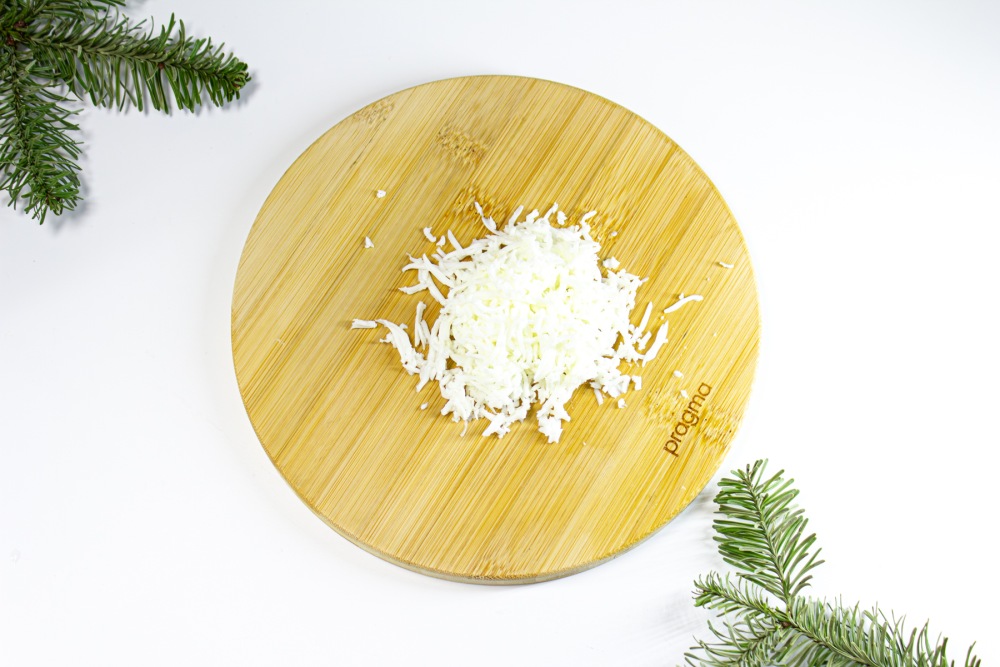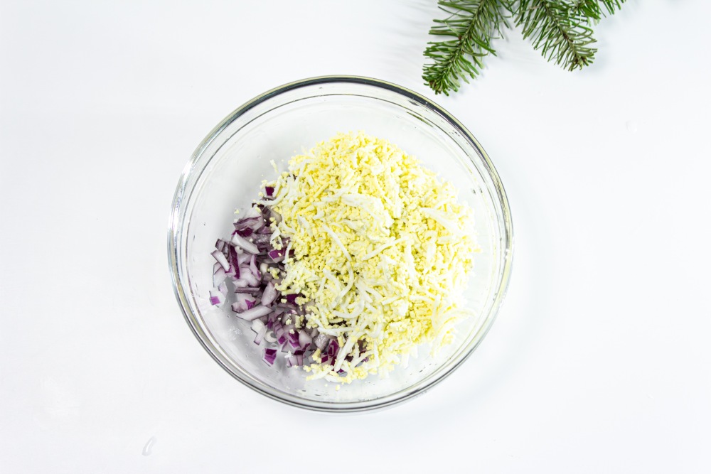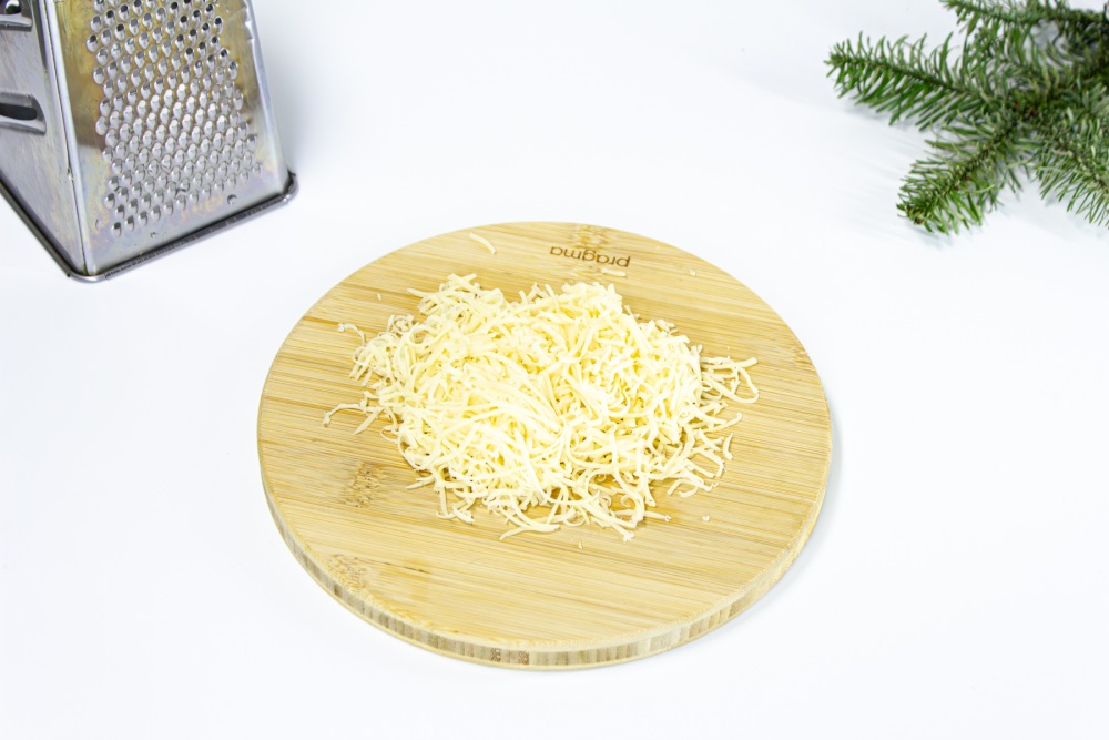 Яйца натереть на мелкой тёрке. Один белок оставить для украшения.