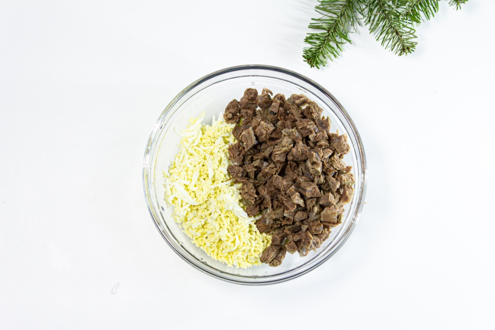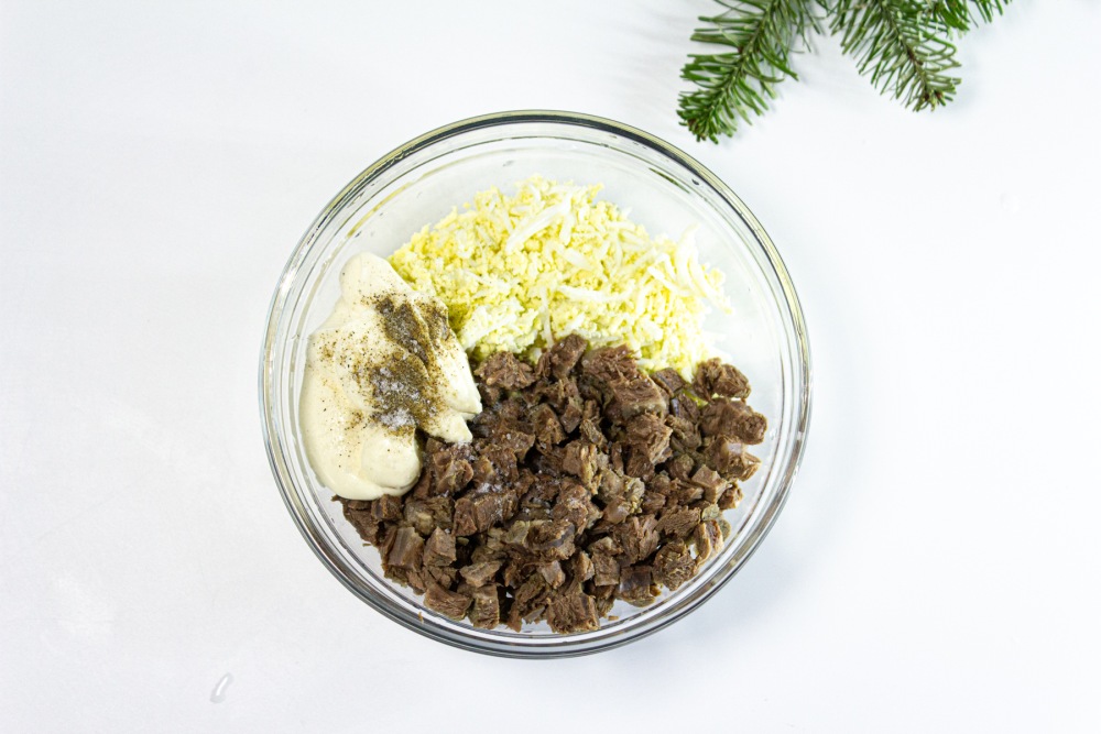 Если говядины нет, подойдёт язык, куриная грудка или даже запечённая индейка — вкус получится другой, но тоже хороший. Майонез можно заменить смесью густого йогурта. Сыр берите тот, что есть: гауда, российский, маасдам — главное, чтобы тёрся без крошки. Лук лучше ненадолго залить кипятком, чтобы убрать горечь, или заменить на зелёный, если хотите совсем мягкий вкус.
