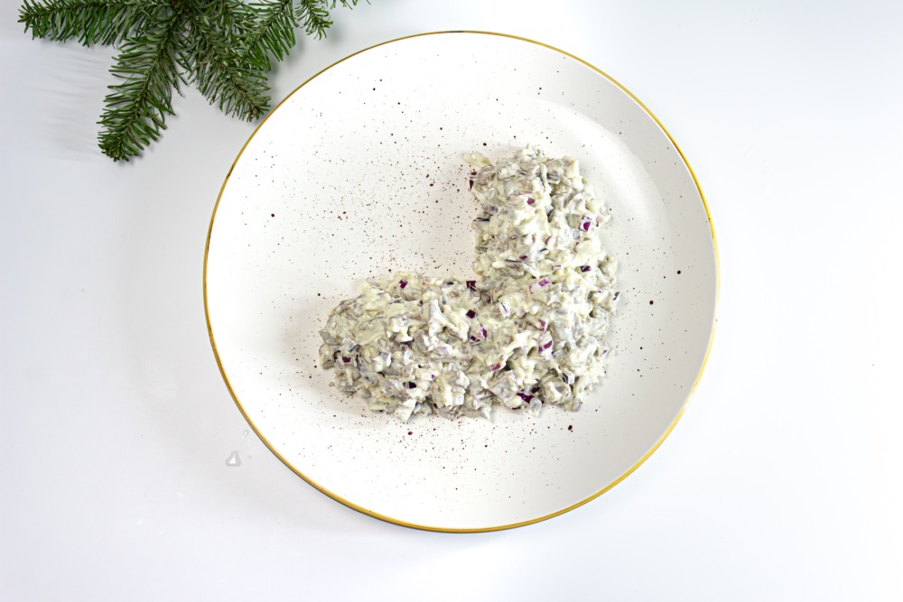 – Вырезайте форму сапожка сразу на большом блюде: так не придётся перекладывать салат и нарушать его рисунок.