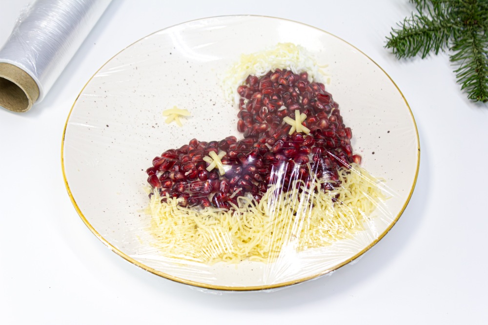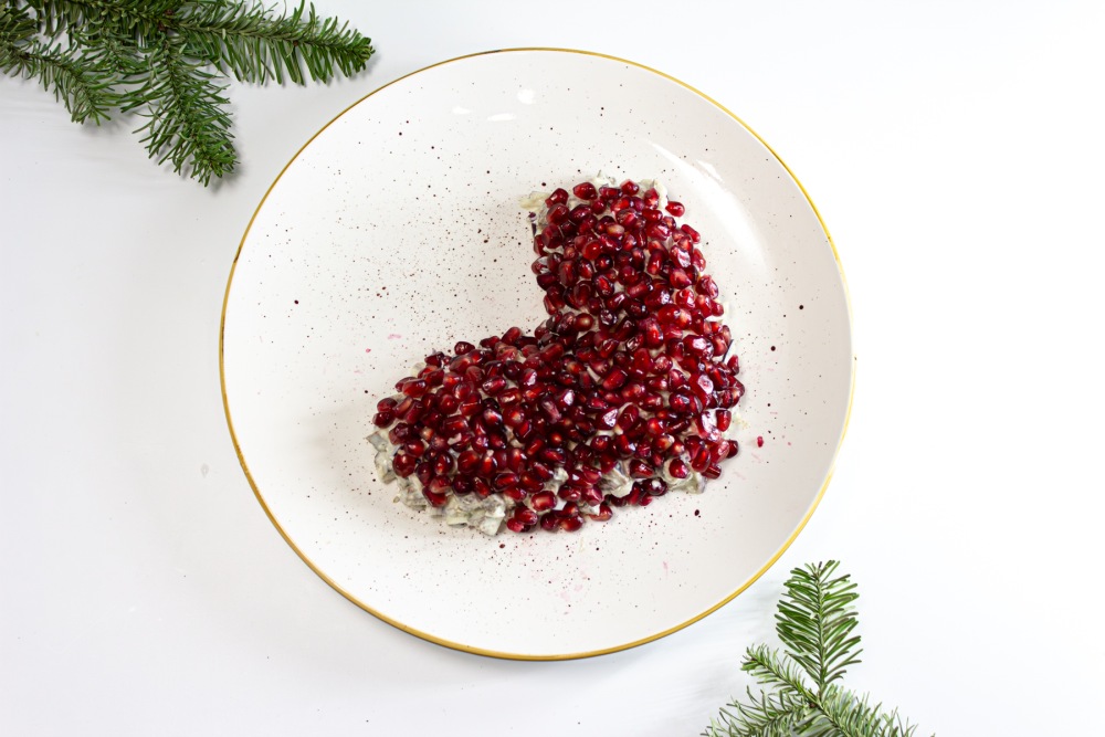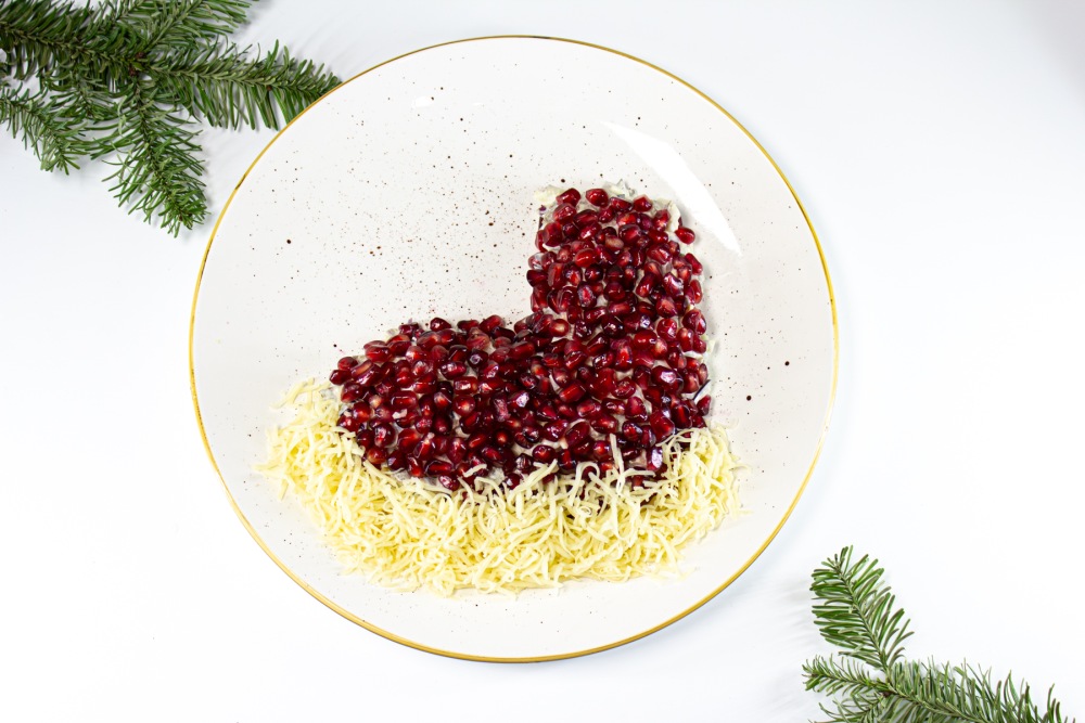 – Отделите зёрна граната заранее: так сок не окрасит остальные слои, можно выложить украшение в последнюю минуту.