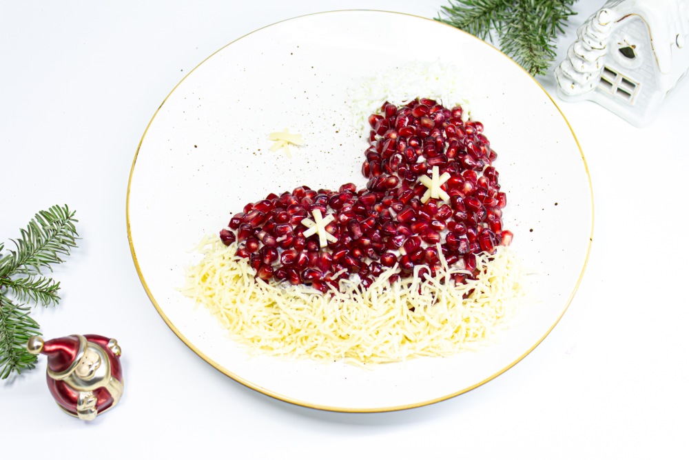– Выкладывайте гранат непосредственно перед подачей: иначе зёрна пустят сок, и сапожок потеряет праздничный “вид”.