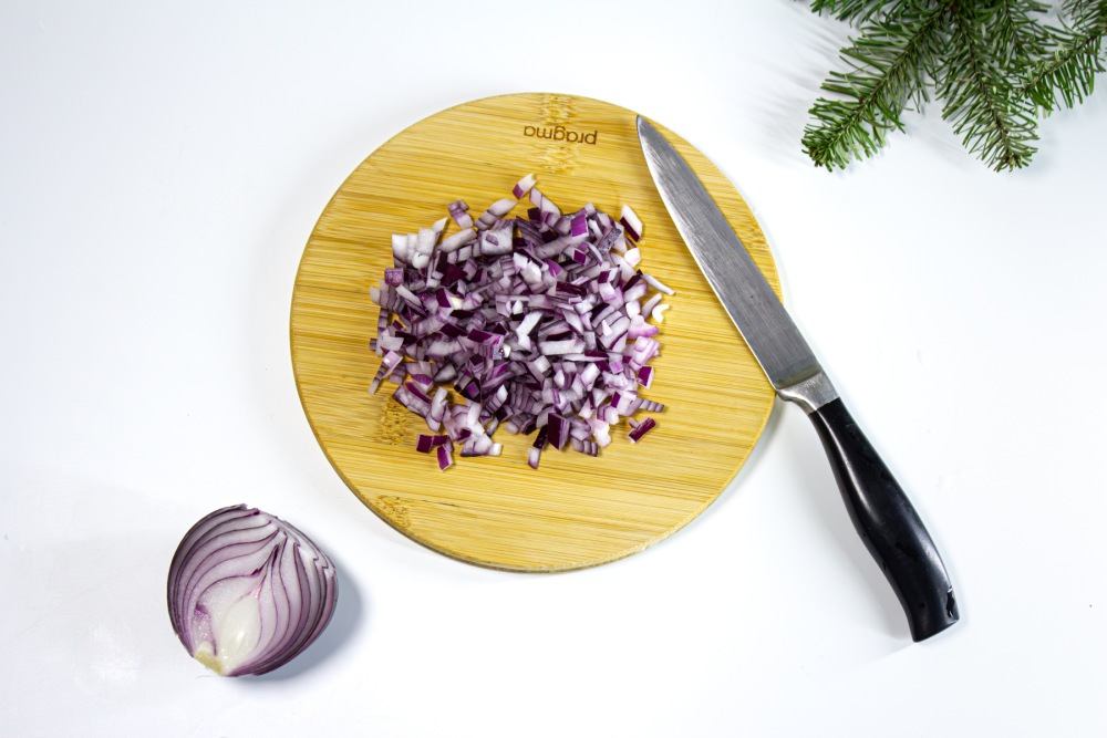 Лук очистить от шелухи, нарезать мелким кубиком, залить кипятком на пару минут (чтобы ушла горечь).