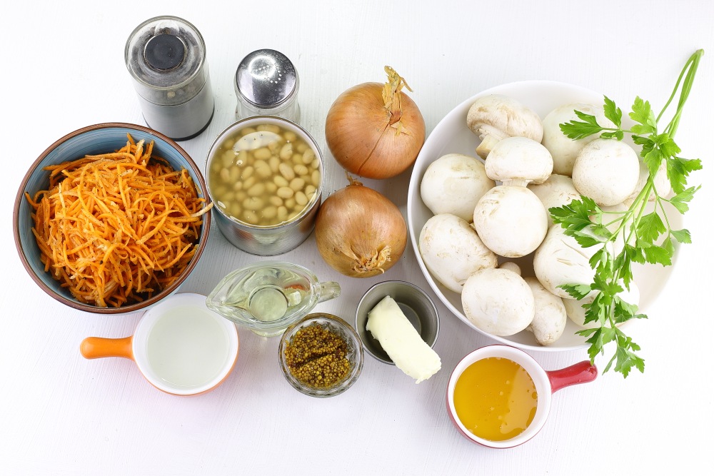 Подготовить необходимые ингредиенты для рецепта салата с грибами и корейской морковью.