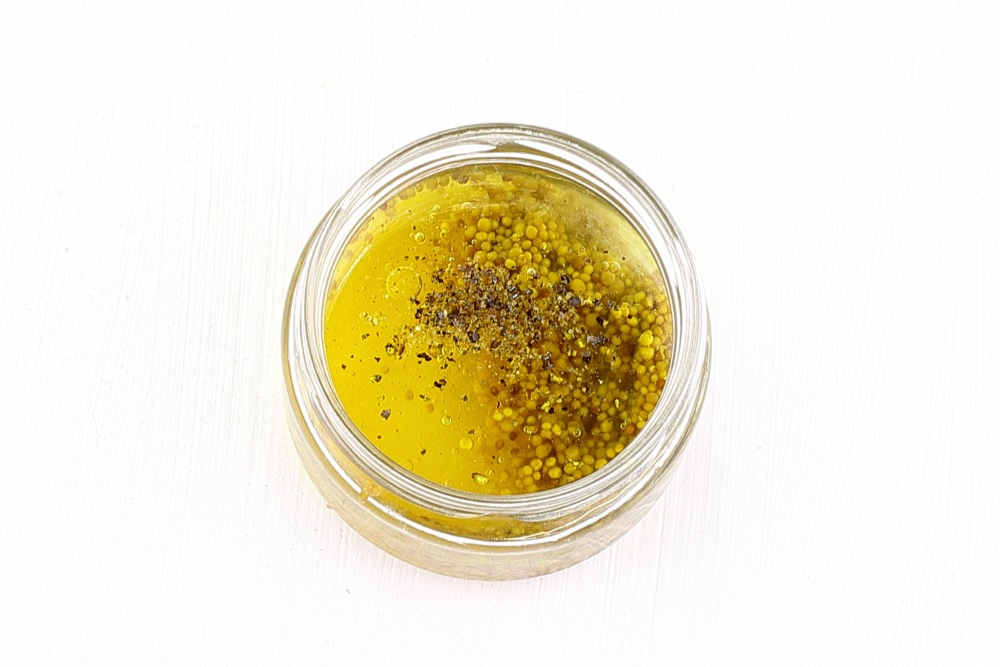 В небольшую баночку с крышкой добавить зернистую горчицу, сок лимона, мед, растительное масло, перец и соль по вкусу, буквально по пару щепоток. Накрыть крышкой и хорошенько взболтать.