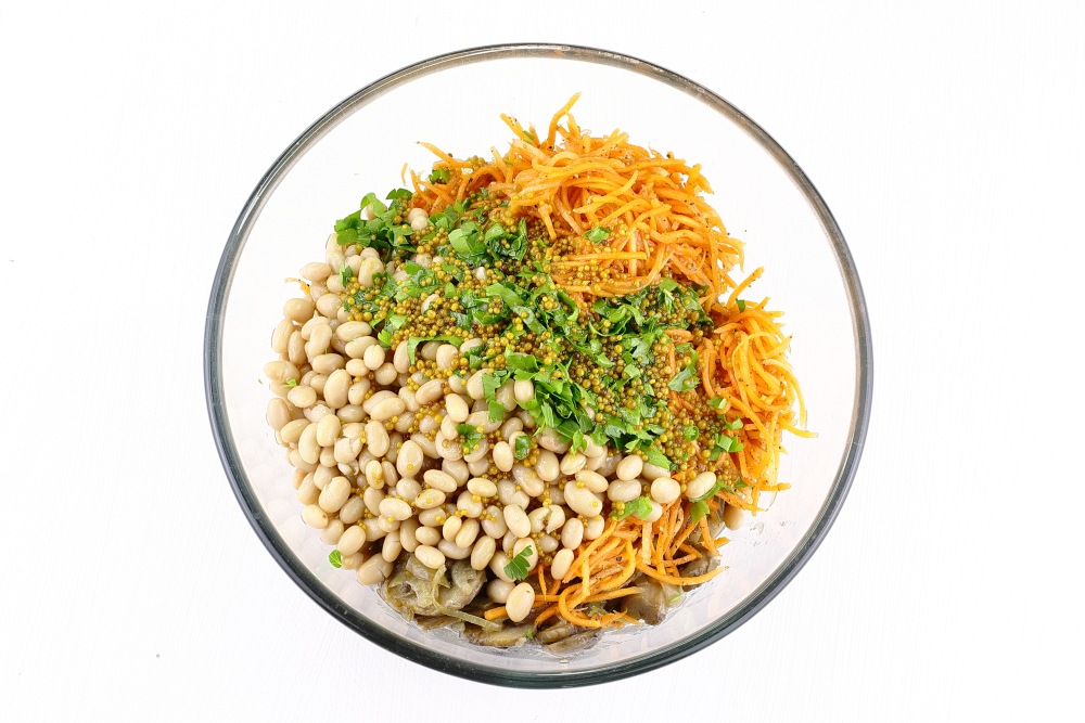 - Используйте готовую корейскую морковь из магазина и консервированную фасоль.