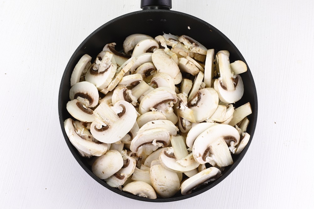 Шампиньоны хорошо промыть проточной холодной водой. Обсушить бумажным полотенцем от лишней влаги. Нарезать крупными пластинками. Пересыпать в разогретую глубокую сковороду без масла.