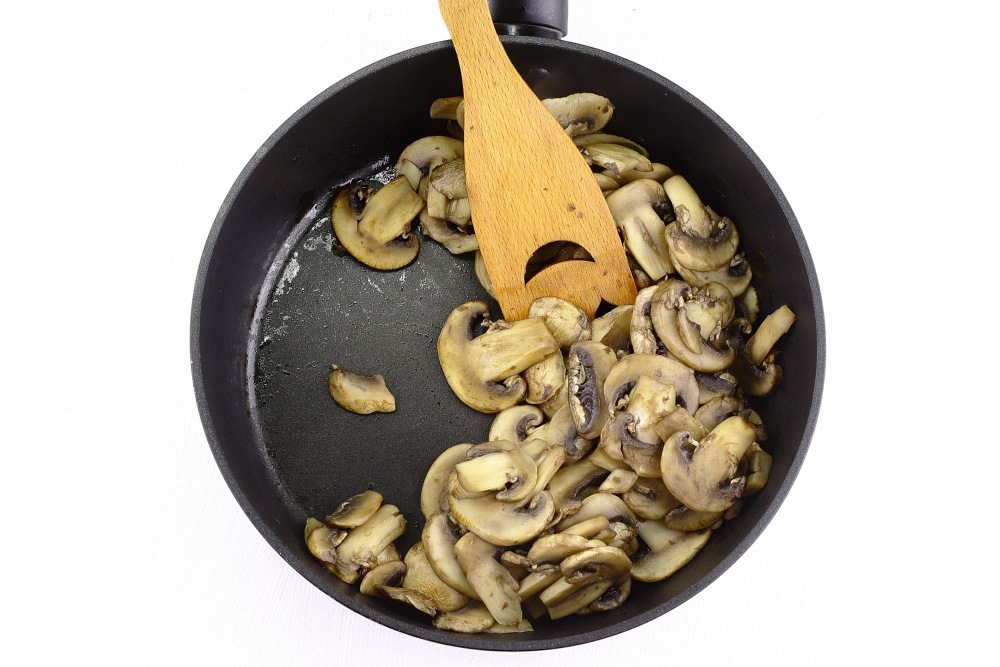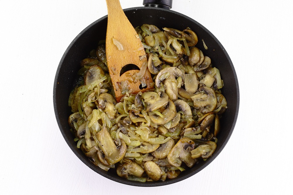 Жарить на умеренном огне до золотистого цвета и готовности всех ингредиентов. Жареные грибы остудить до комнатной температуры.