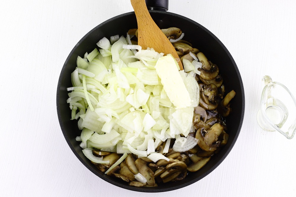 Очистить лук. Сполоснуть в холодной воде. Обсушить полотенцем. Нарезать тонкими четверть кольцами. Как только в сковороде испарится жидкость, добавить к грибам лук, 30 мл растительного масла и сливочное масло.
