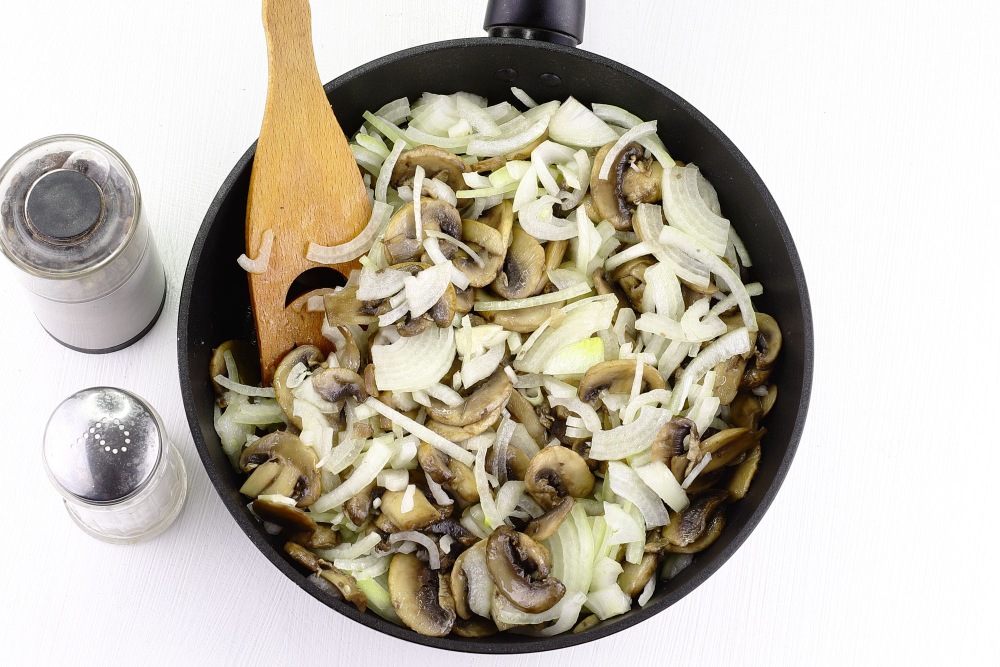 Грибы перемешать с луком. Приправить по вкусу солью и перцем.