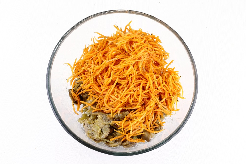 В глубокий салатник добавить остывшие шампиньоны и морковь по-корейски.