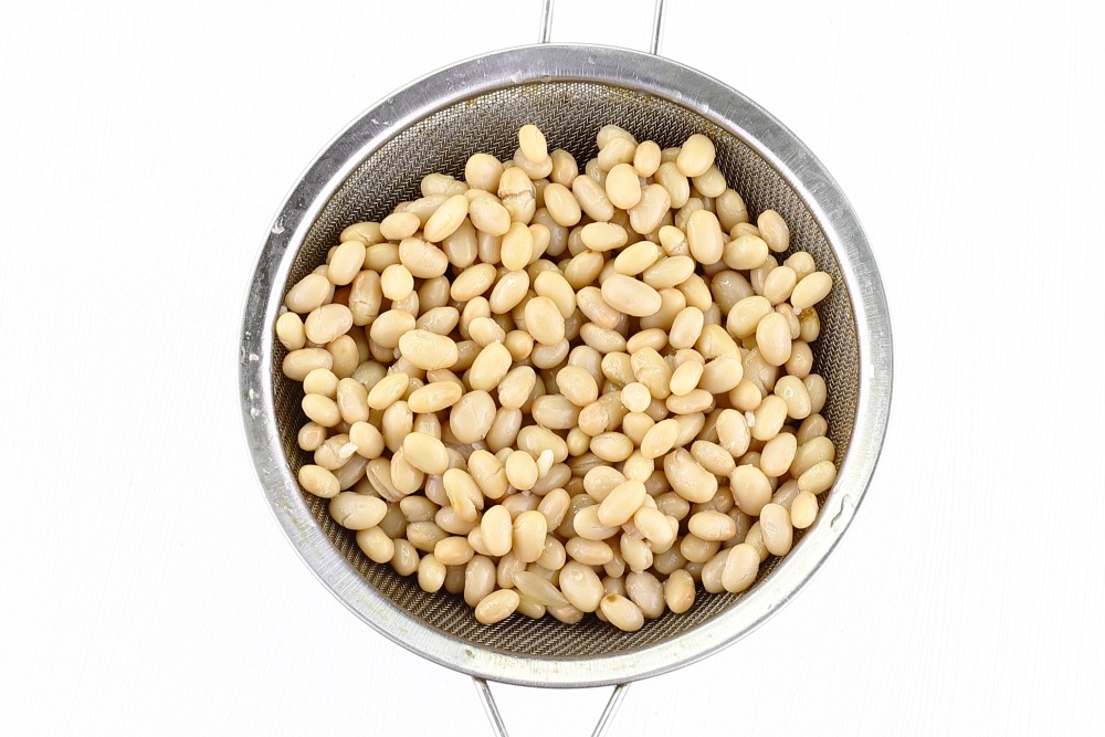 Консервированную фасоль откинуть на сито и хорошо сполоснуть холодной водой.
