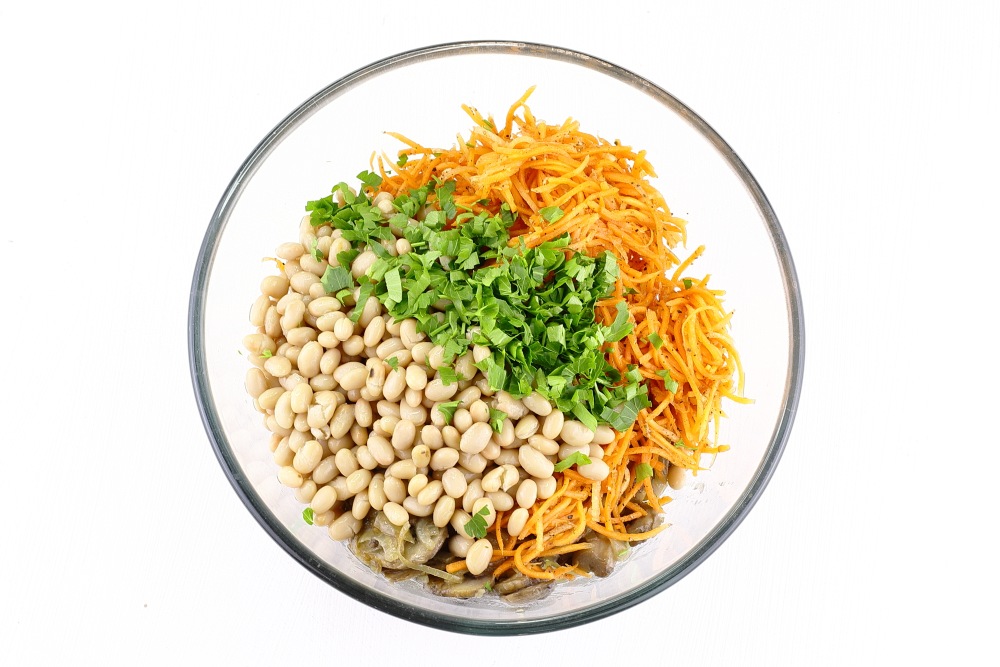 Добавить фасоль в салатник к обжаренным грибам и корейской моркови. Свежую петрушку либо другую зелень сполоснуть под проточной водой, обязательно обсушить бумажным полотенцем, чтобы лишняя влага не испортила текстуру салата, и мелко нарезать. Добавить зелень к остальным ингредиентам.