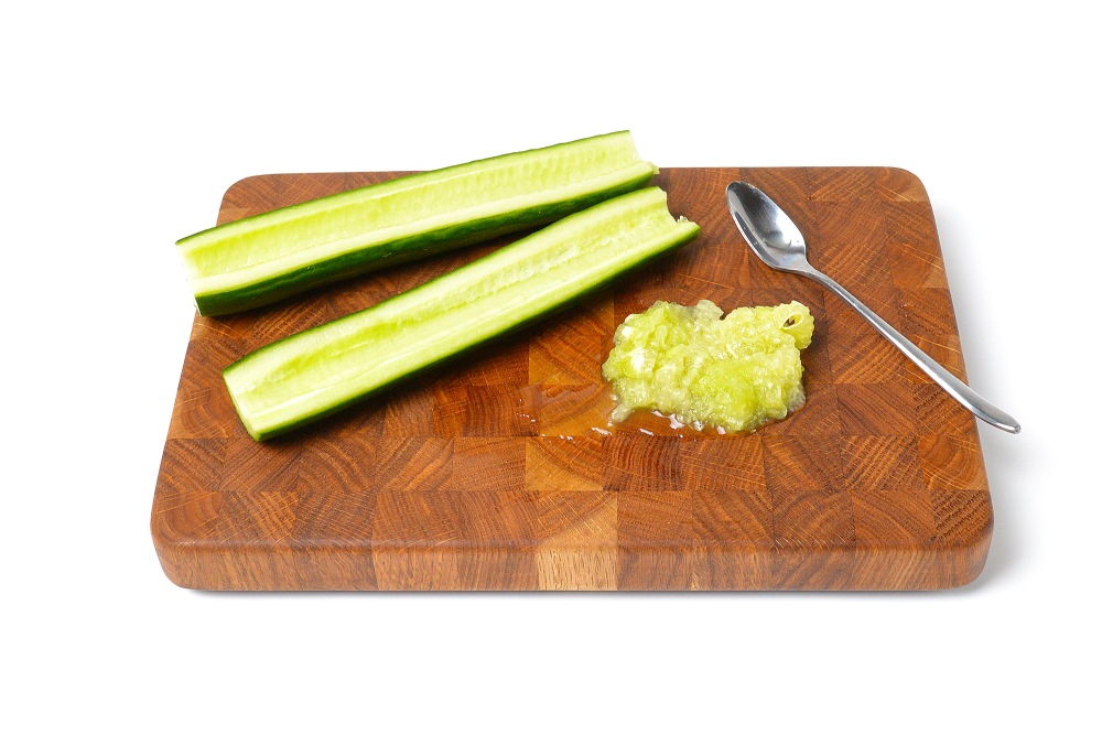 Огурцы разрезать пополам и удалить семена небольшой чайной ложкой.