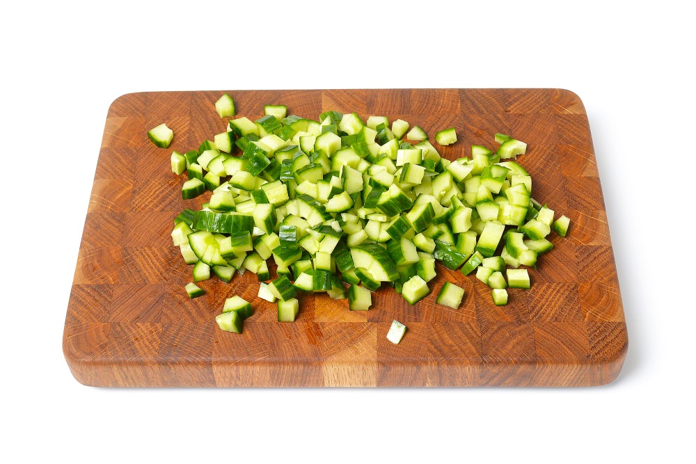 Нарезать огурцы кубиками размером с кукурузу или чуть крупнее.