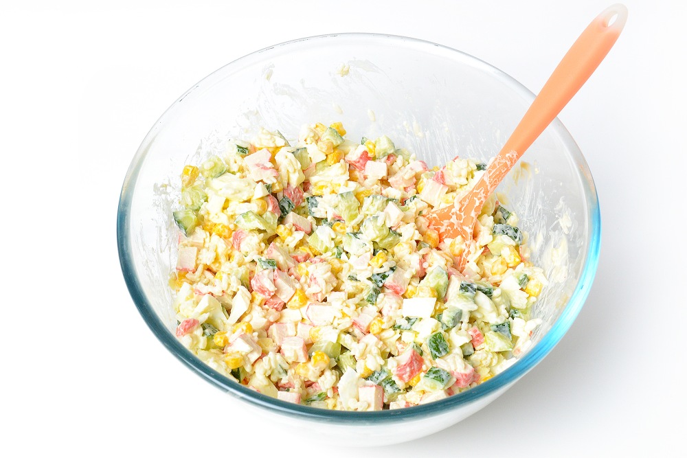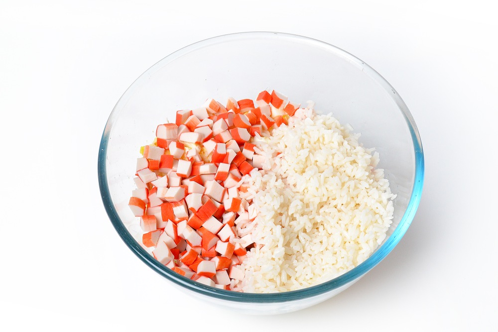 Что улучшит вкус салата с крабовыми палочками и рисом:
