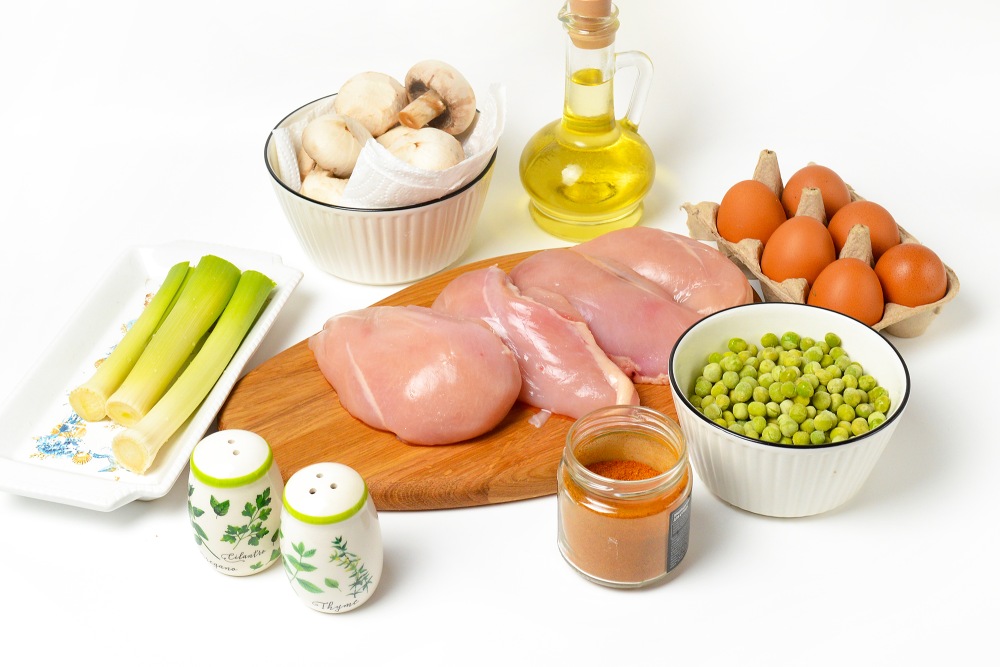 Подготовить ингредиенты: разморозить куриное филе, вкрутую отварить яйца, отвесить горошек, грибы, взять приправы, масло для жарки и лук по желанию.