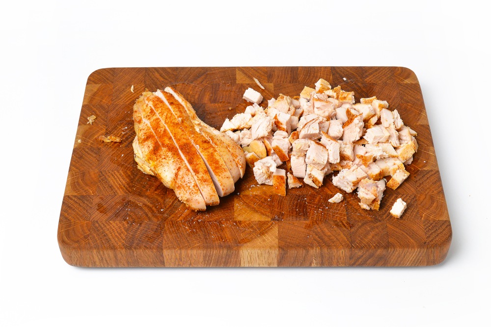 Остывшее филе нарезать мелкими кубиками. Если используете окорок, обязательно очищайте его от кожи.
