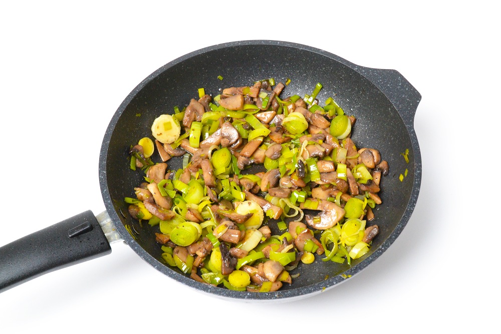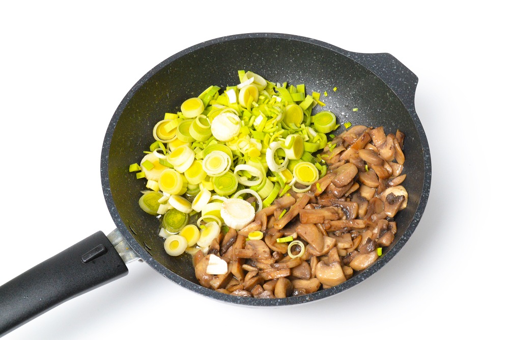 Сковороду с растительным маслом разогреть на сильном огне. Выложить грибы и обжарить 5-6 минут на огне чуть ниже максимального. Когда вода почти полностью испарится, выложить лук-порей.
