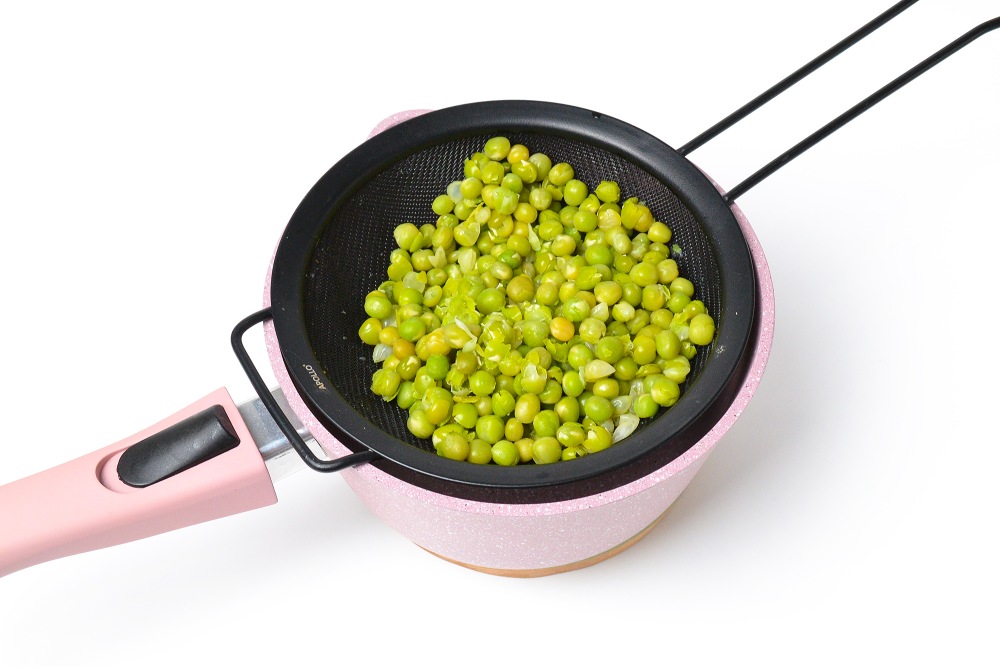 Отварить горошек 5 минут, обдать холодной водой и откинуть на сито.
