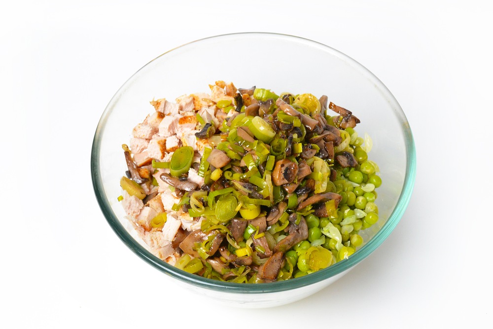 В глубоком салатнике объемом 2,5-3л смешать яйца, нарезанную курицу, горошек и остывшие грибы с луком.