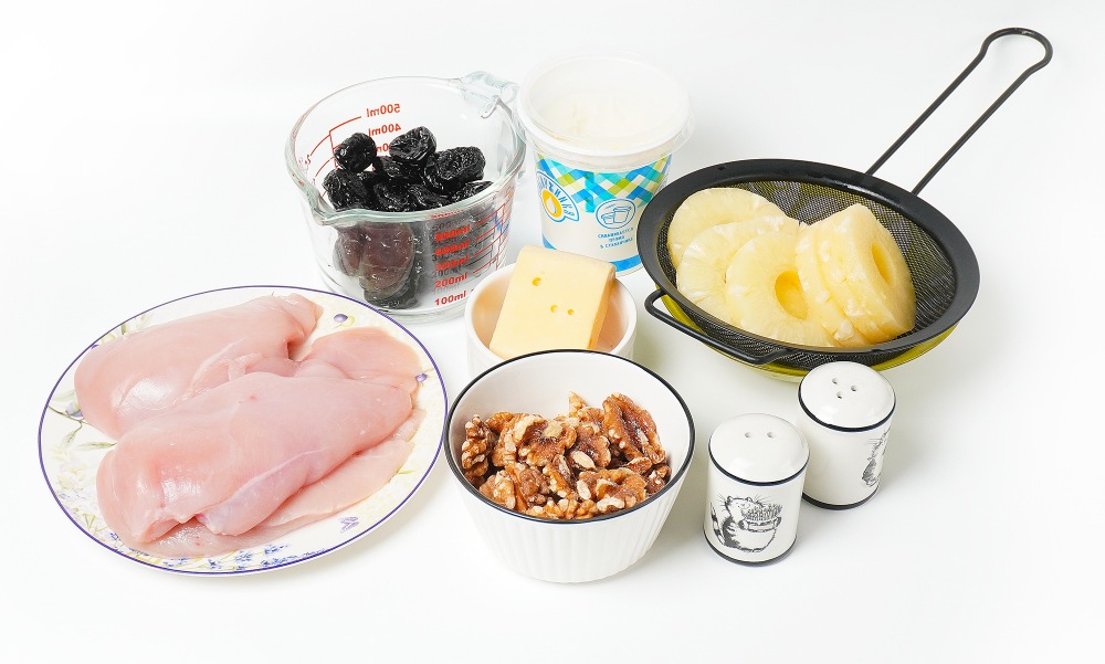 Подготовить ингредиенты: куриное филе, чернослив, ананасы, сыр, грецкие орехи и майонез с солью.
