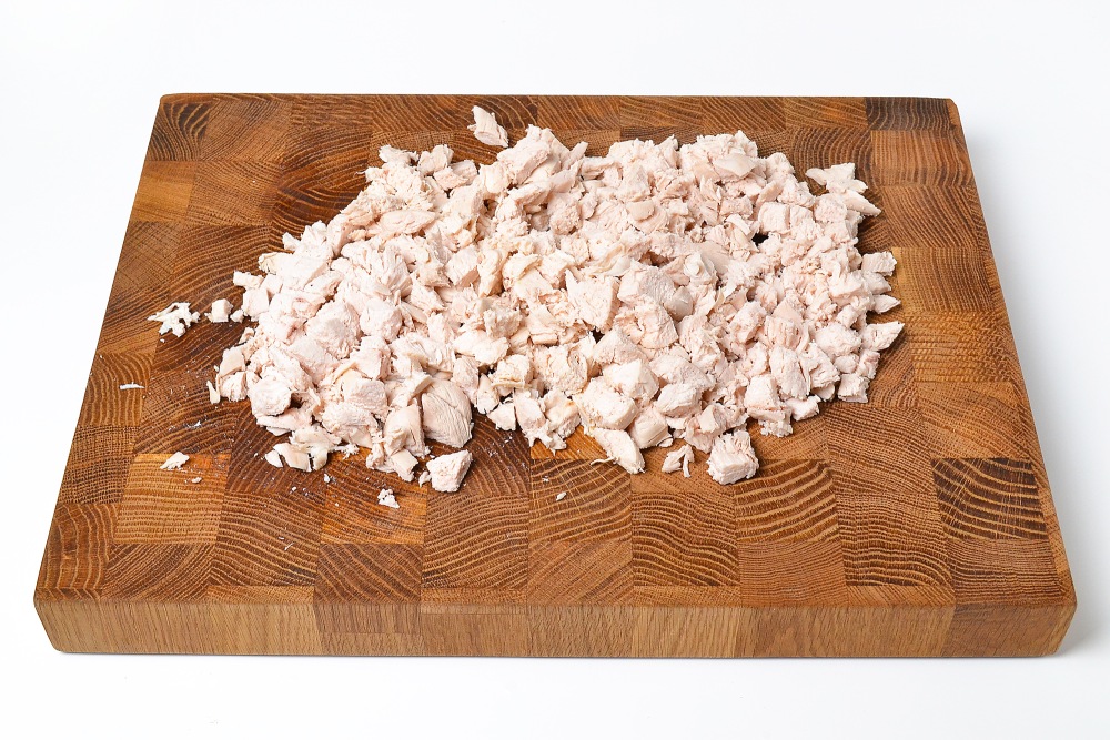 Мелко нарезать отварное куриное филе.