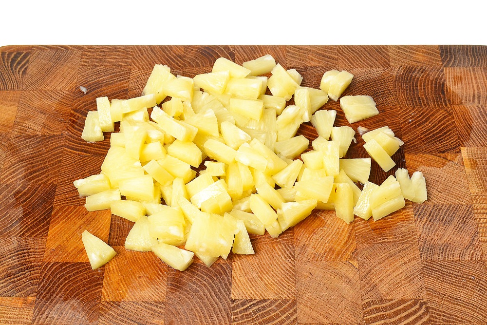 Кольца ананасов также обмакнуть бумажными полотенцами и нарезать тонкими кусочками.