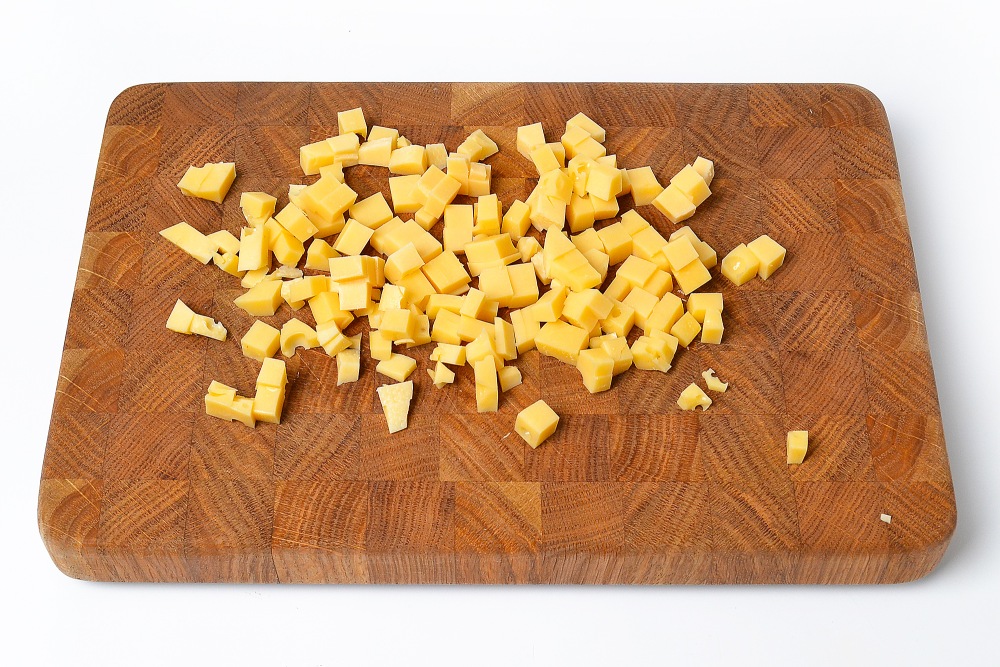Сыр нарезать мелким кубиком. На терке лучше не натирать, так как он «потеряется» в общей массе.