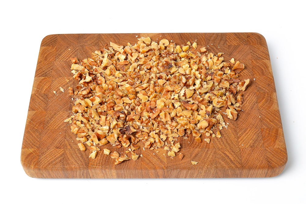 Грецкие орехи измельчить ножом. Убедитесь, что части скорлупы не попали в салат.