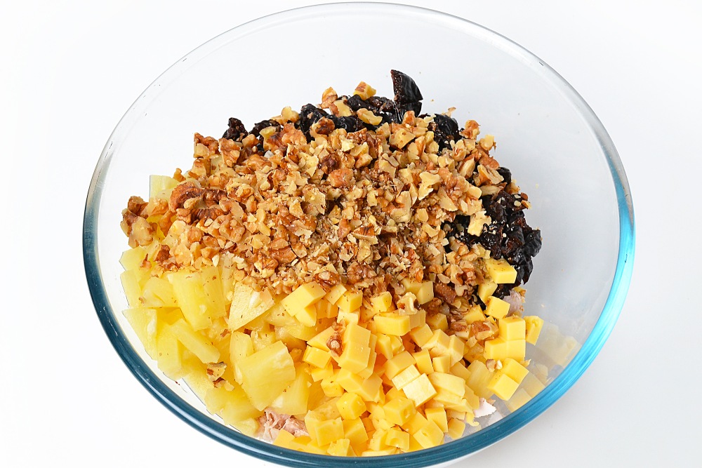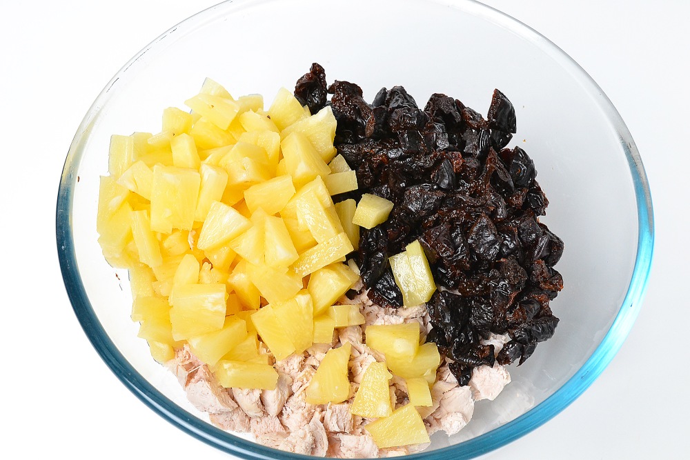 Смешать ананасы, курицу и чернослив.