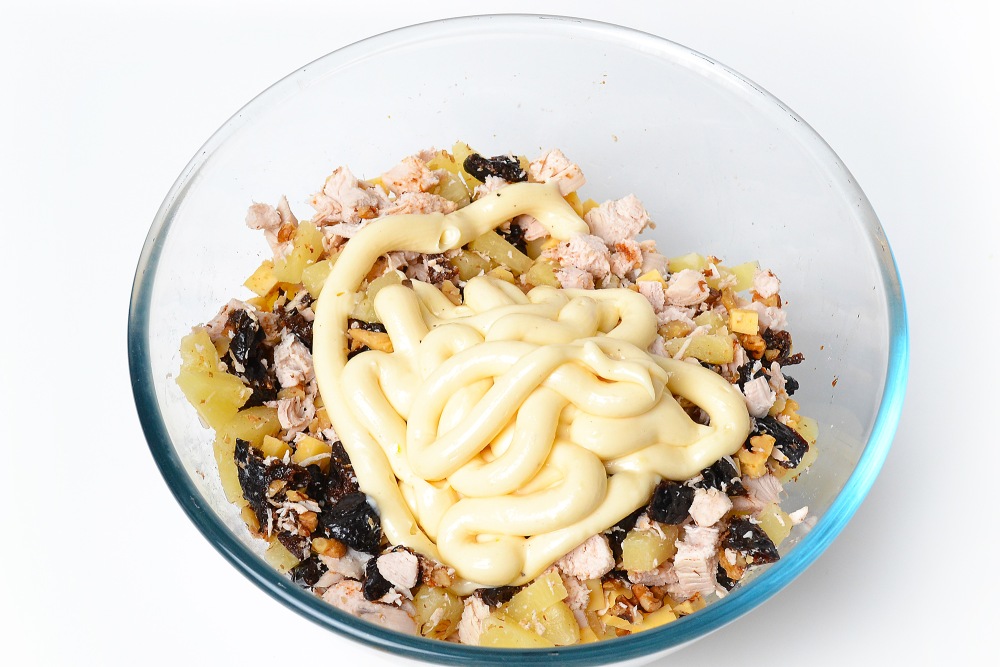 – Удаляйте воду с курицы, чернослива и ананасов, чтобы салат «не поплыл» при настаивании.