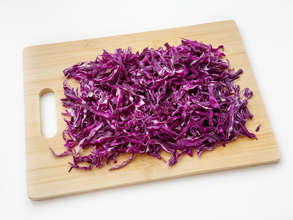 Тонко нарезать краснокочанную капусту.