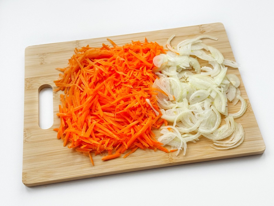 Морковь натереть на крупной терке. Лук нарезать тонкими полукольцами.