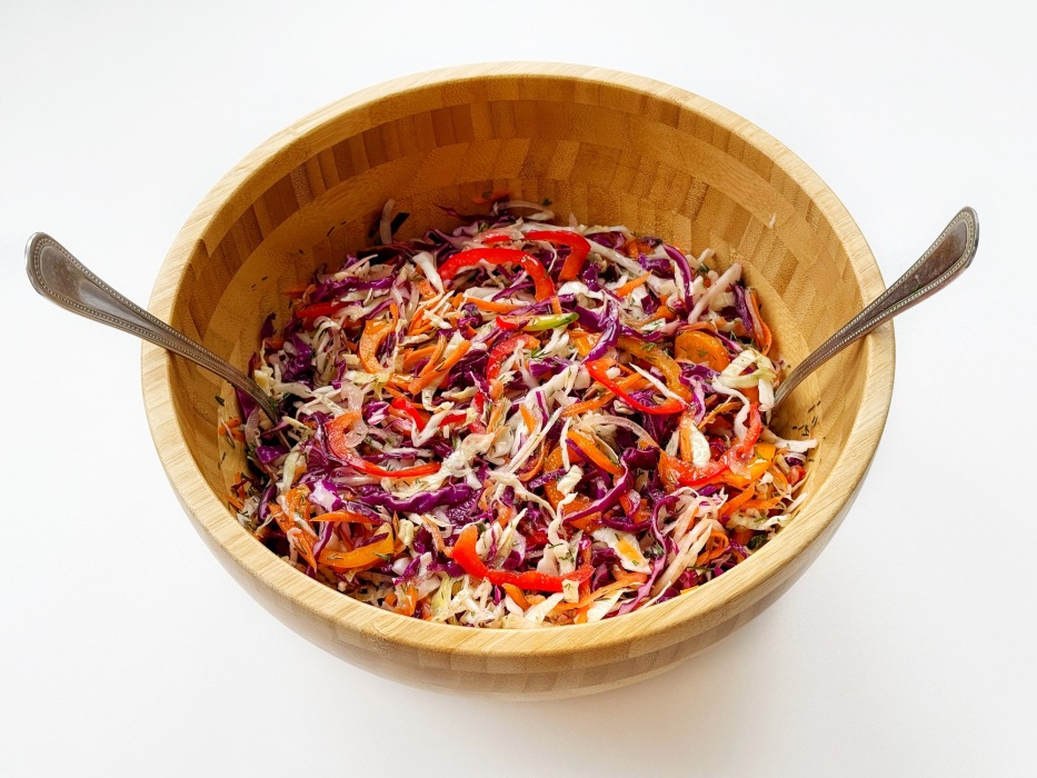 Капуста прекрасно сочетается с самыми разными овощами. К привычным моркови и болгарскому перцу можно добавить редьку, сельдерей, огурцы или помидоры и каждый раз салат будет звучать немного по-новому. А простая заправка из растительного масла и уксуса объединяет все вкусы и делает блюдо свежим, легким и по-домашнему вкусным.
