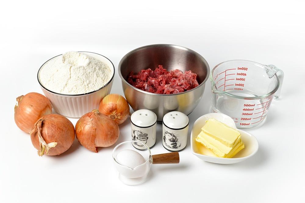 Подготовить ингредиенты: муку, фарш, лук, масло, специи и воду.