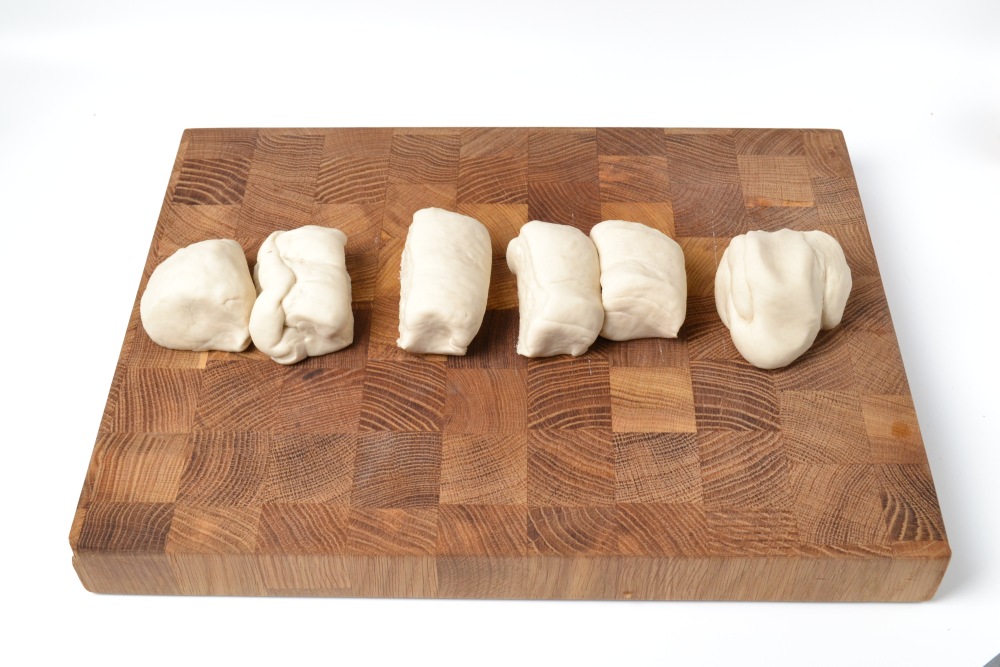 Тесто разделить на 6 равных частей для 2 рулетов. Я использовала весы – кусочки вышли по 100-110 г. Те, что были меньше, пошли на 1 рулет, те, что побольше – на второй.