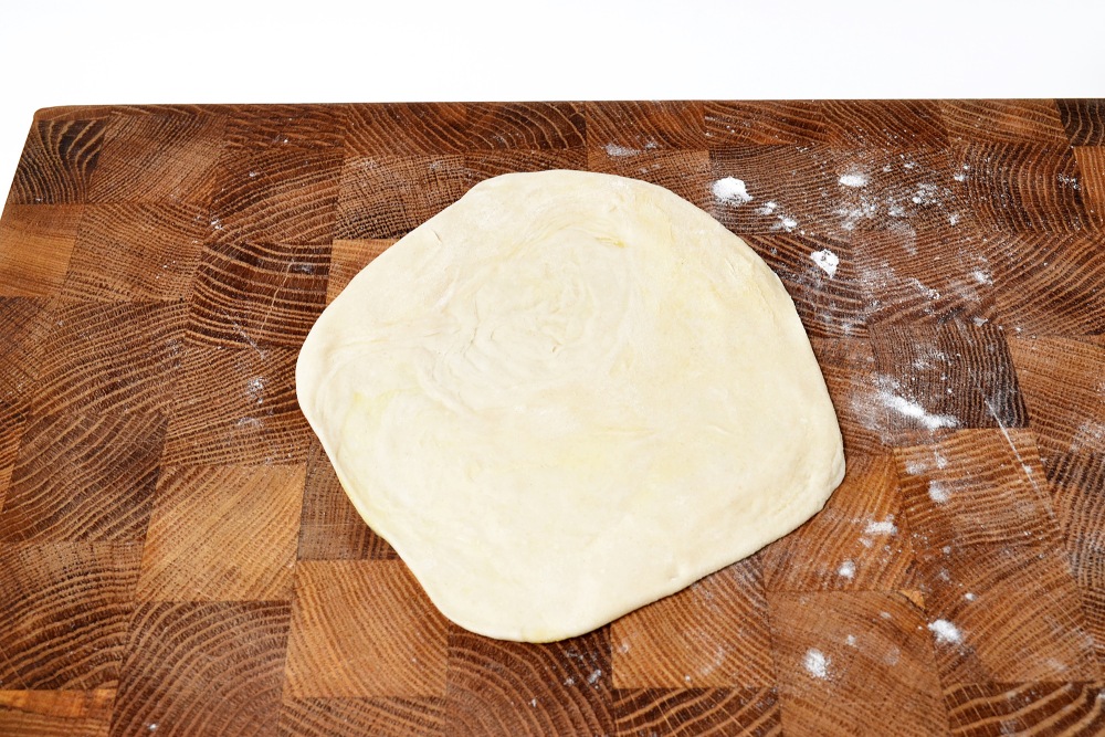 Положить кусочек срезом вверх и раскатать: края чуть тоньше, чем серединка, но не до прозрачности.