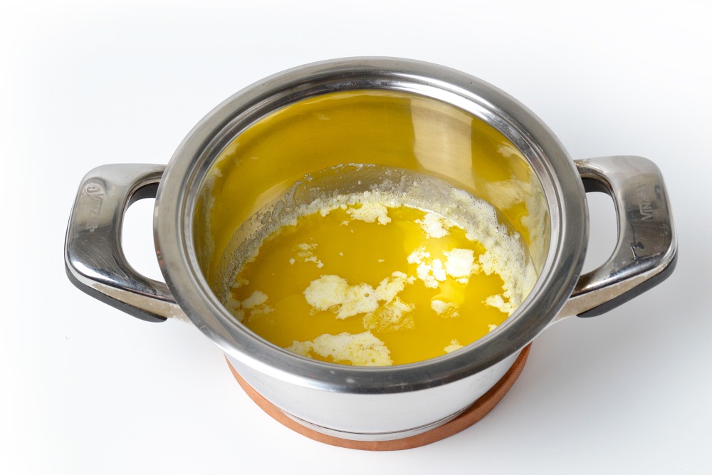 Первым делом растопить все сливочное масло на небольшом огне (2/6 для электроплиты) и немного остудить, перелив в небольшую мисочку или оставив в кастрюльке.