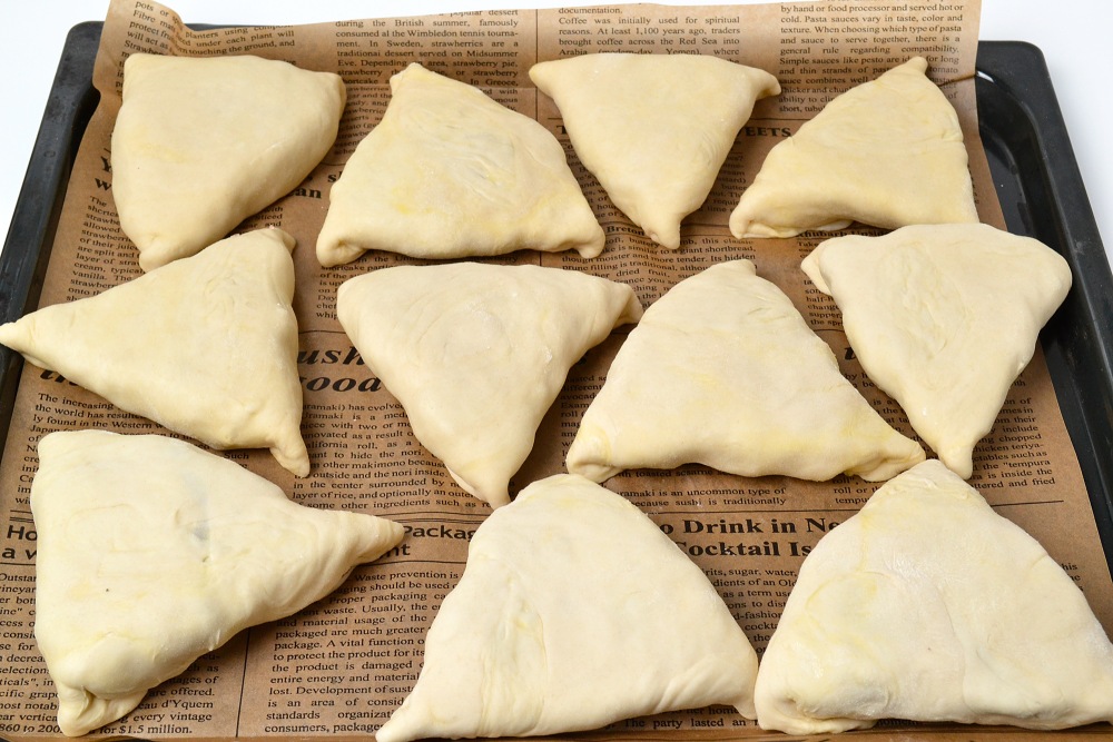 – Используйте качественный силиконизированный пергамент, чтобы самса не прилипала, либо смазывайте обычную пекарскую бумагу растительным маслом перед выкладыванием пирожков.