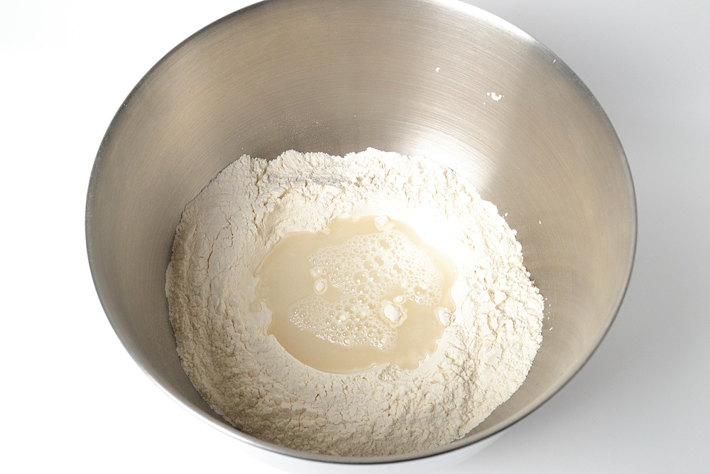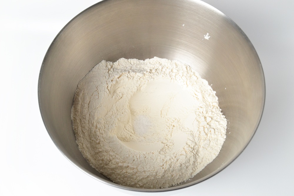 В глубокую миску высыпать 450 г муки и сделать углубление в ней по центру. Добавить 0,5 ч. л. соли. Я замешиваю тесто в планетарном миксере с насадкой «крюк», но для ручного замеса действия те же самые.